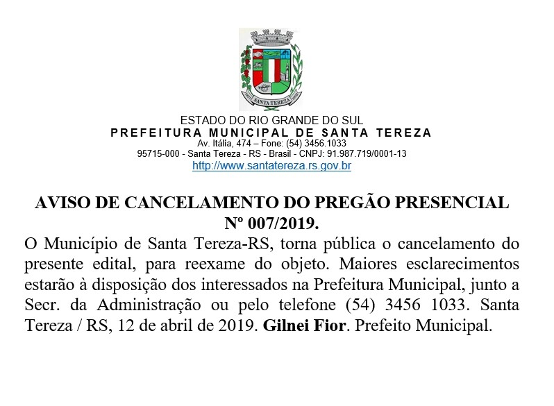 CANCELAMENTO PREGÃO PRESENCIAL N° 007/2019