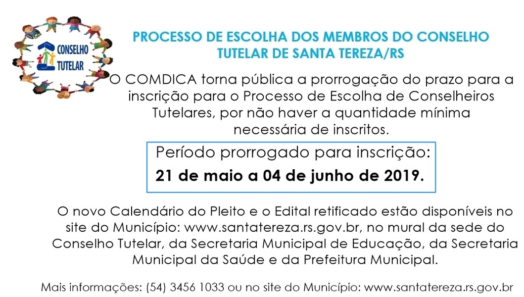 PRORROGA O PRAZO DE INSCRIÇÃO PARA O PROCESSO DE ESCOLHA DOS MEMBROS DO CONSELHO TUTELAR E RETIFICA O CALENDÁRIO DO PLEITO DO EDITAL N° 001/2019