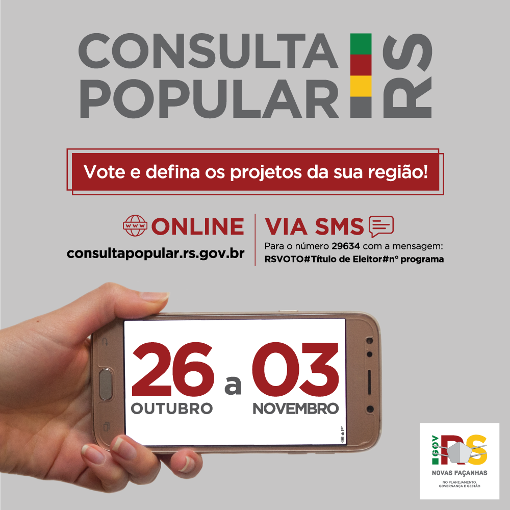 A população poderá votar em um projeto em votação virtual, e para participar é necessário entrar no site da Consulta Popular (www.consultapopular.com.br) e digitar o número do título eleitoral antes de clicar no projeto escolhido ou por SMS (para o número 2963 com a mensagem RSVOTO#Título de Eleitor#nº programa – Exemplo: RSVOTO#123456789#4).