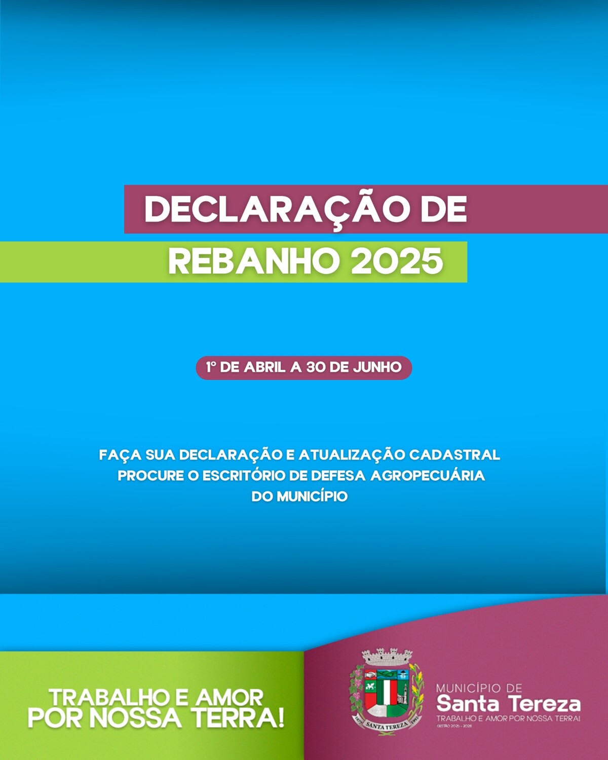 Os pecuaristas de Santa Tereza devem realizar a Atualização Cadastral das Explorações Pecuárias e a Declaração Anual de Rebanho dentro do prazo estabelecido para 2025, que vai de 1º de abril a 30 de junho.