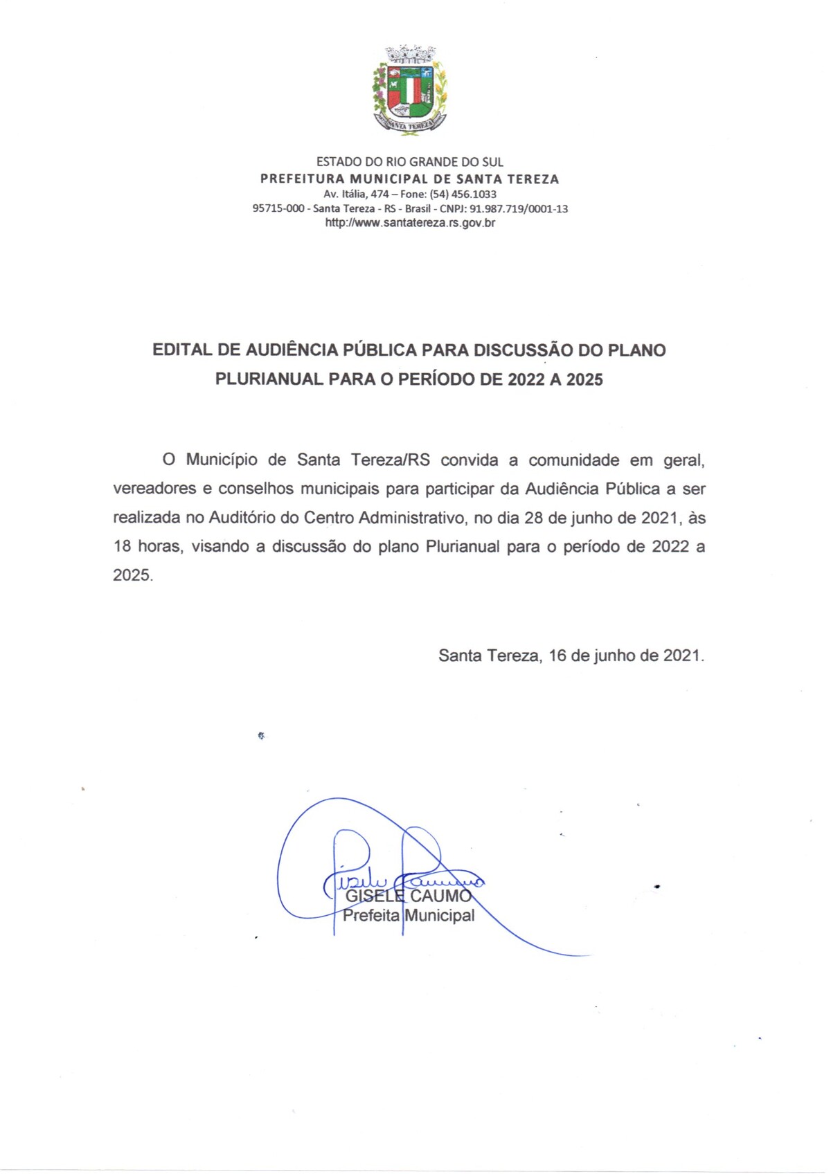 Convidamos a comunidade a participar da Audiência Pública visando a discussão do Plano Plurianual para o período de 2022 a 2025, a realizar-se no dia 28 de junho de 2021, às 18 horas, no Auditório do Centro Administrativo.