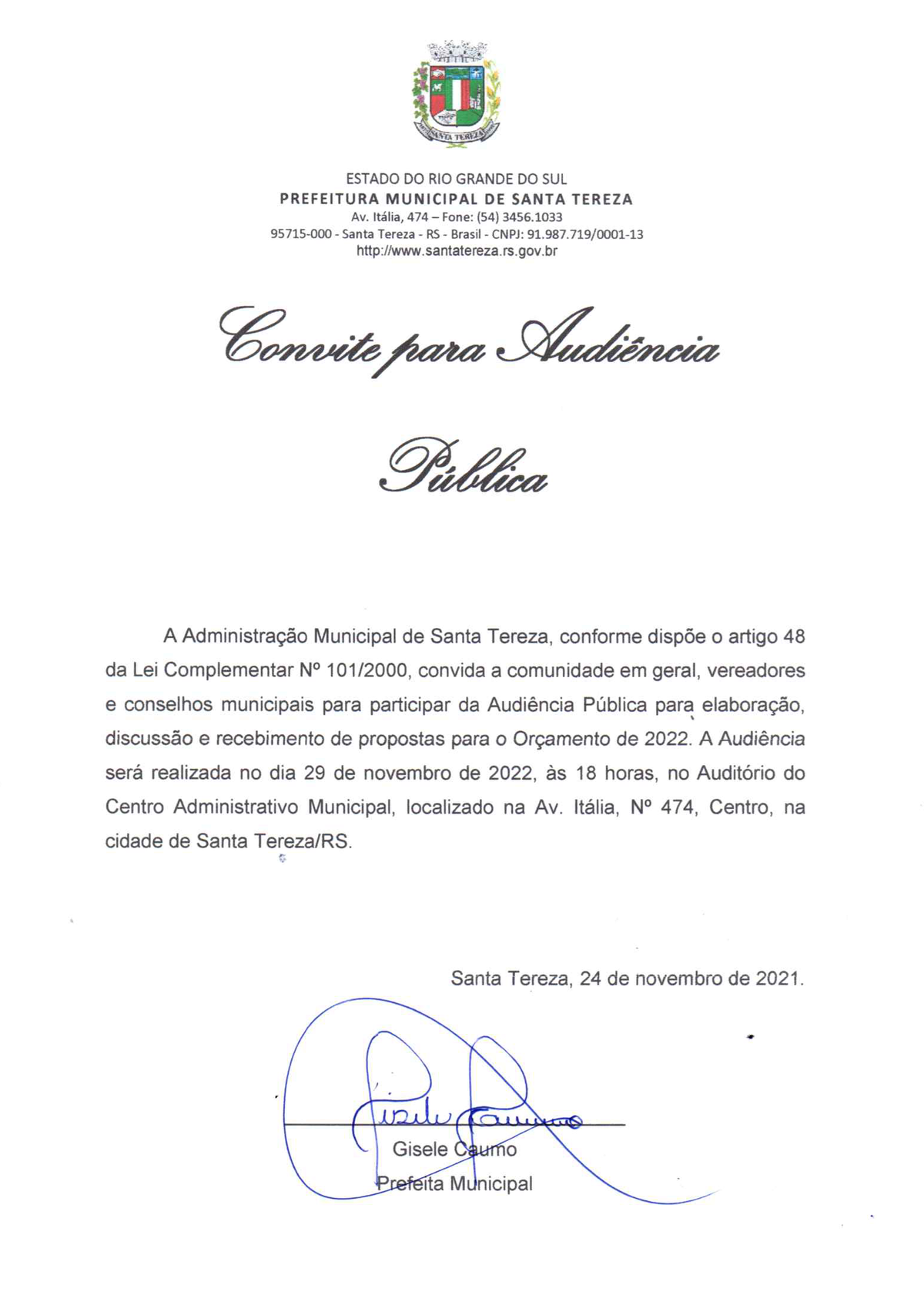 A Administração Municipal de Santa Tereza convida a comunidade em geral, vereadores e conselhos municipais para participar da Audiência Pública para elaboração, discussão e recebimento de propostas para o Orçamento de 2022 a realizar-se no dia 29 de novembro de 2022, às 18 horas, no Auditório do Centro Administrativo Municipal.