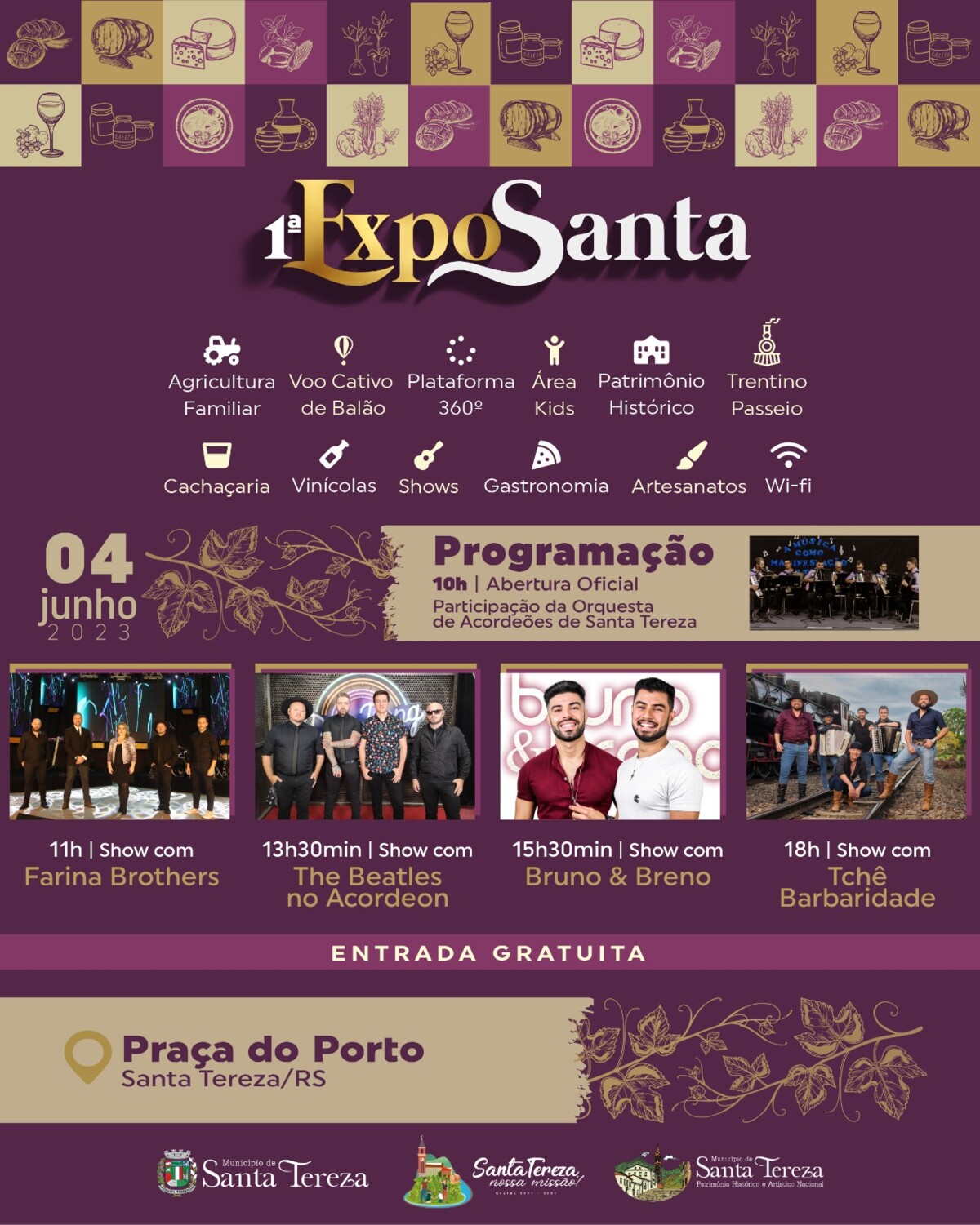 📢 Vem aí a 1ª edição da ExpoSanta, que será realizada no dia 04 de junho, na Praça do Porto, em Santa Tereza/RS.